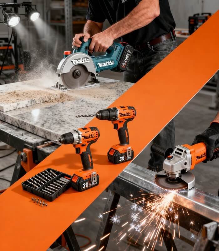 • Corte e Desbaste: Serras Mármore (Makita), Esmerilhadeiras angulares, Serras Circulares, Serras Tico-tico e Serras de Meia Esquadria.
