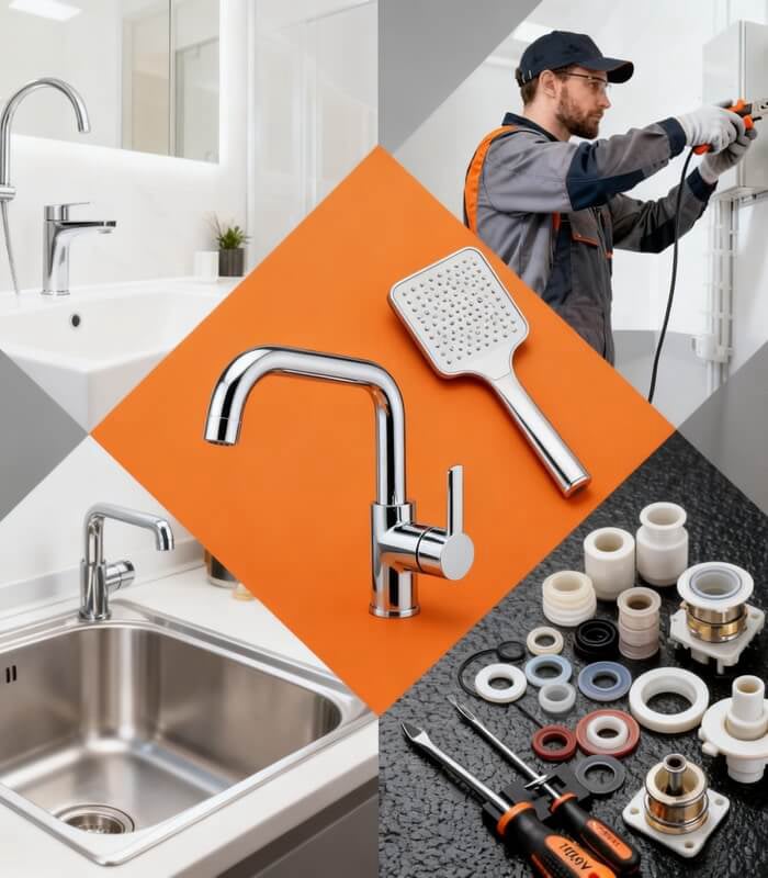 • Torneiras e Misturadores: Modelos para lavatório, cozinha