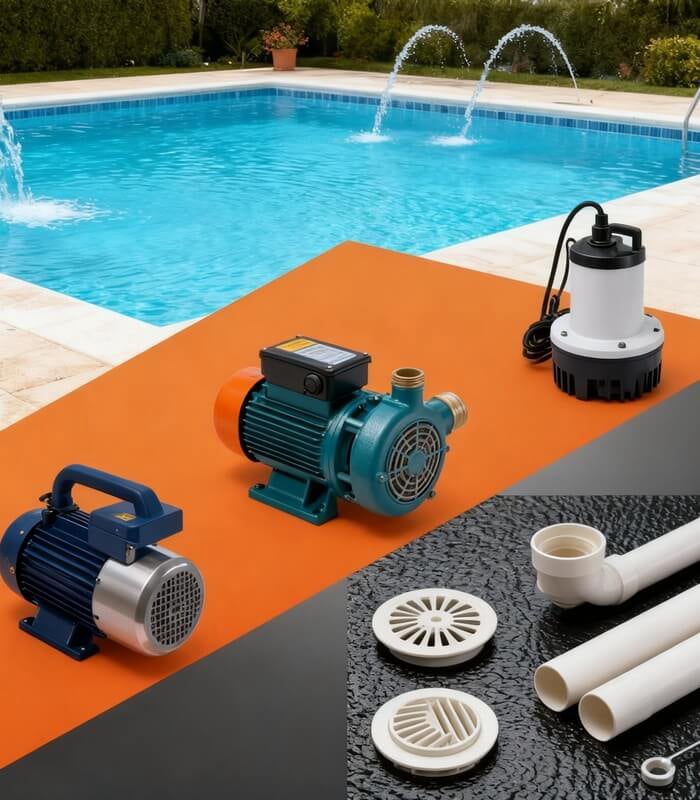 • Itens para Piscina: Dispositivos de aspiração, retorno, drenos de fundo e tubagens específicas resistentes ao cloro e produtos químicos.