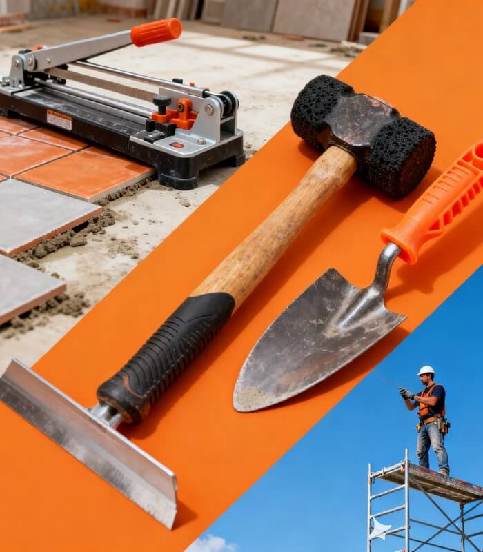 • Pedreiro e Revestimento: Colheres de pedreiro, Desempenadeiras (aço, madeira e plástico), Cortadores de piso manuais, Martelos de borracha e Masseiras.