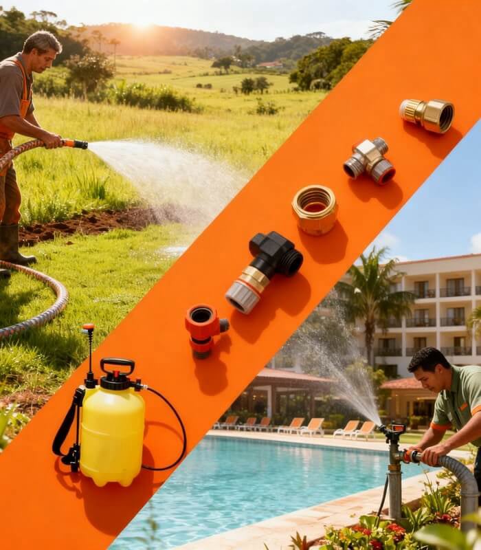 • Mangueiras e Irrigação: Mangueiras de jardim (reforçadas), Esguichos e conectores de engate rápido.
