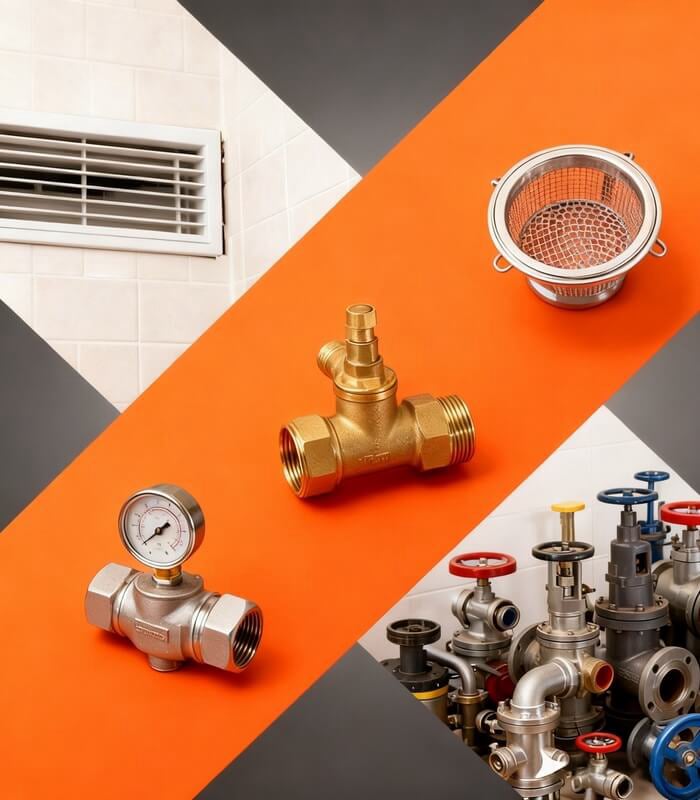 • Válvulas: Válvulas de retenção, válvulas de pé com crivo, válvulas de segurança para aquecedores e redutores de pressão.